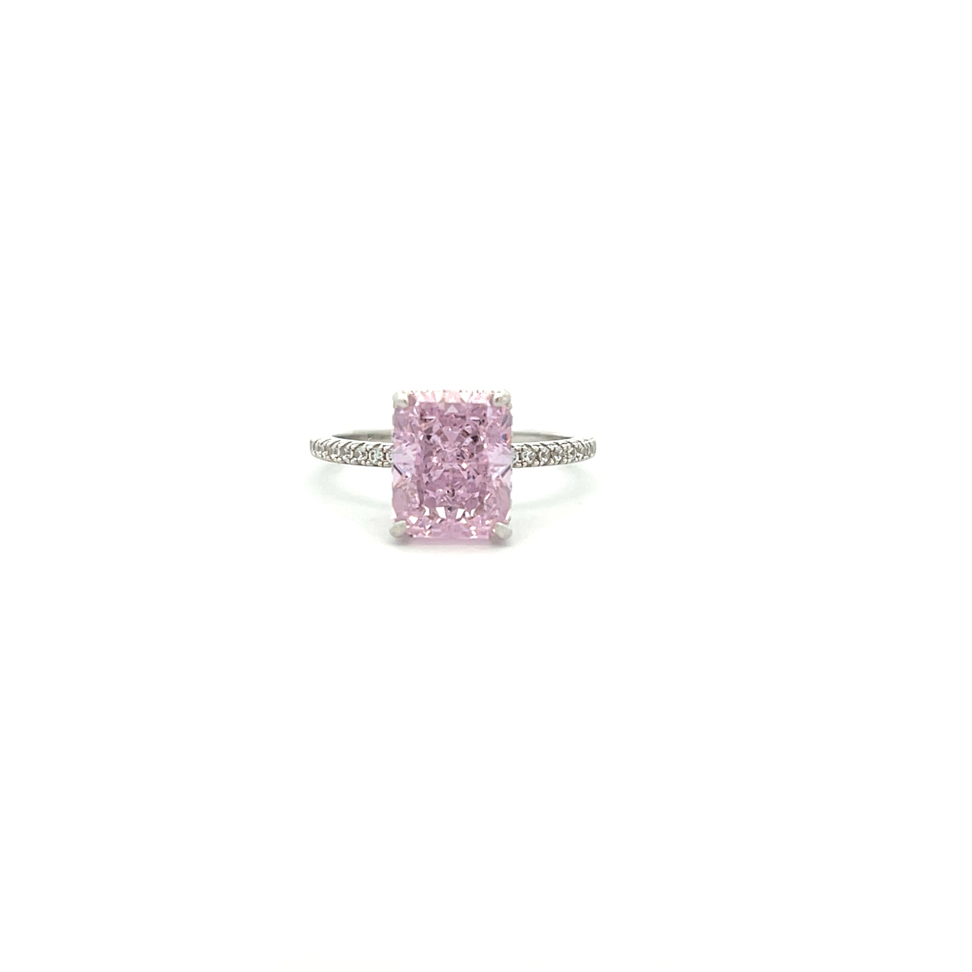 טבעת אלגנטית ומרשימה העשויה כסף מלא 925 באיכות גבוהה, משובצת אבן זירקון ורודה בחיתוך רדיאן בעלת ברק עמוק ונוכחות יוקרתית