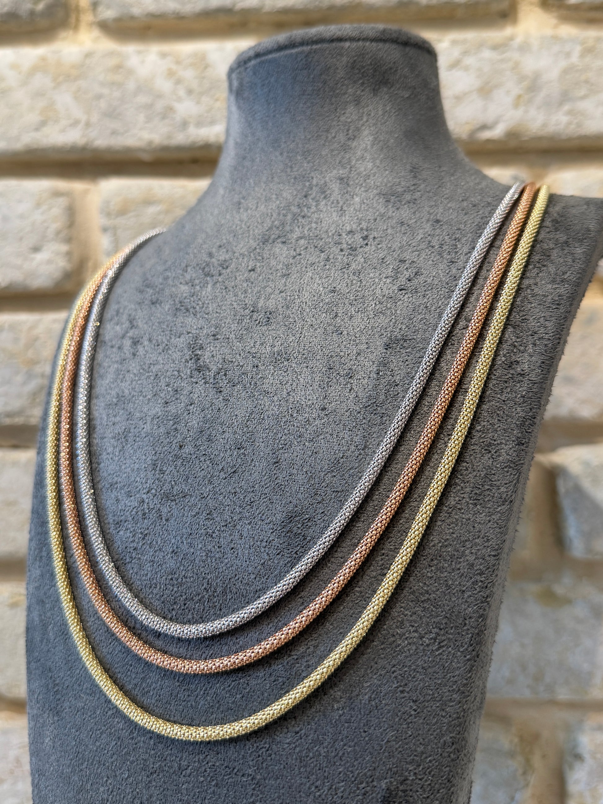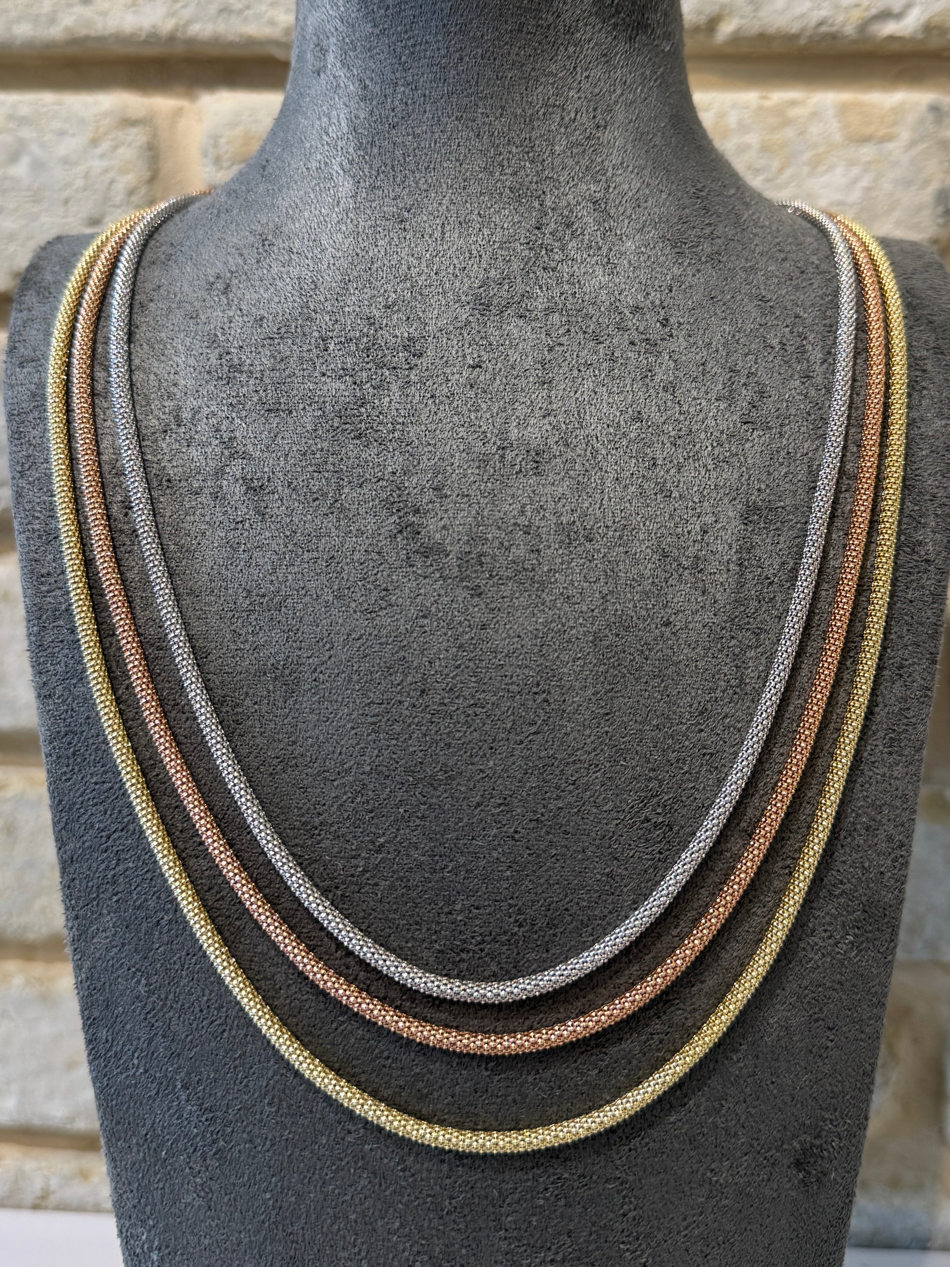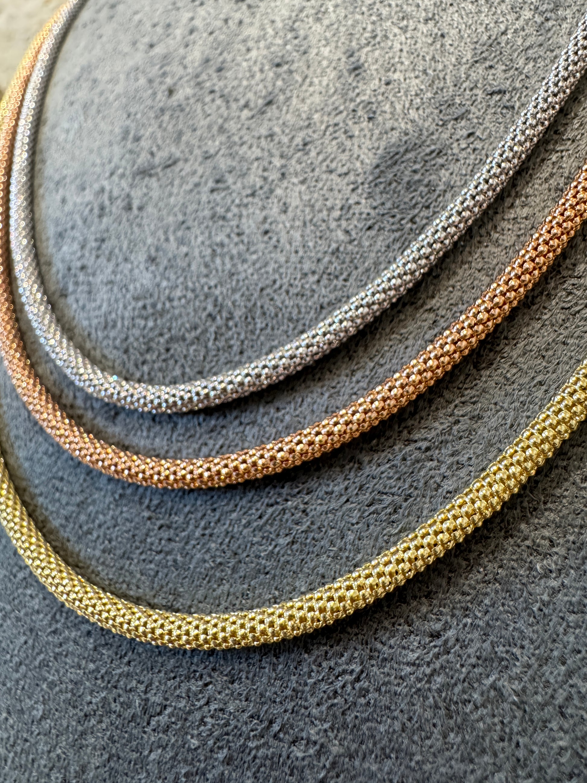 שרשרת פופקורן עשויה כסף 925 איטלקי איכותי, בציפוי זהב יוקרתי המעניק לה מראה עשיר ואלגנטי. עיצוב הפופקורן המיוחד מעניק לשרשרת ברק ונצנוץ. השרשרת נוחה, עמידה ומשדרת איכות וגימור ברמה גבוהה.